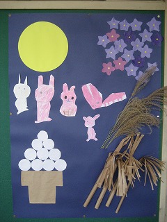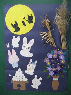 9月は、お月見の壁面飾りを作りました。絵を描いたり、切ったり、貼ったりする作業だけでなく、イメージを膨らませて季節に合った物を考えたり、貼るバランスを考えたりとみんなの知恵を出し合って制作しています。今後、秋から冬にかけての制作物も楽しく作っていきたいと思います。