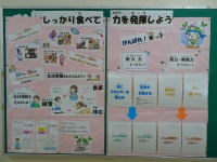 職員室前の掲示板は、食生活や食べ物の栄養などの食育の内容を紹介しています。