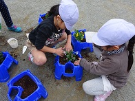 「球根はとがっているほうが上になるようにするんだね。」「苗のまわりにはしっかり土を入れよう。」と友達同士で声をかけあい、楽しみながら植えていました。