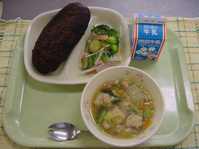牛乳 ココア揚げパン 白菜と肉団子のスープ