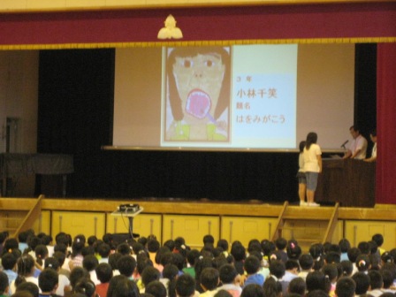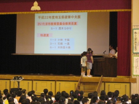 本日、表彰朝会を行いました。硬筆制作会からの展覧会入賞者、歯の衛生週間作品の入賞者を紹介し、全員で拍手を送りました。
