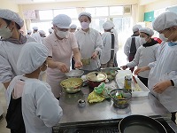 1時間目、家庭科室からとってもいい匂いが漂ってきました。中に入ると、6年生が小学校最後の調理実習を行っていました。今日は主菜のじゃがいも料理と副菜の2品作っていました。ジャーマンポテトにポテトツナハンバーグ、切り干し大根、温野菜サラダなどバランスの整った献立を班ごとに考えて実践していました。職員室の先生にもおすそ分けがありました。