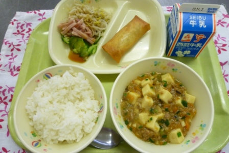 牛乳 ご飯 春巻き マーボー豆腐 もやしのナムル