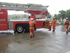 最新式の大きなはしご車が、4階まではしごを伸ばし、救助する際の停車位置等を確認していました。