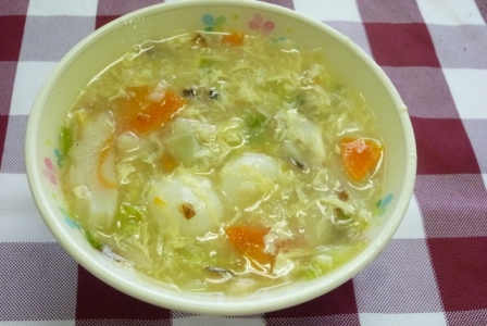 野菜や魚介類、白玉団子などが入った具だくさんのスープで、
