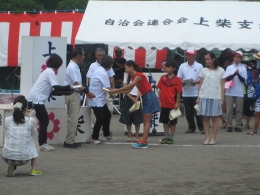 8月6日、上柴中央公園にて第35回ふるさと上柴まつりが開催されました。上柴地区の新しい町づくりに合わせて、35年前から行われている伝統行事です。開会式では、本校の川本さん(5年生)と伊東さん(6年生)がポスターの優秀賞で表彰されました。また、たくさんの児童が暑さに負けずに各自治会の子どもみこしを担ぎ(引き)ました。