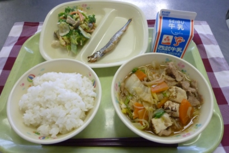 給食は、肉やねぎの他にも白菜や焼き豆腐が入った