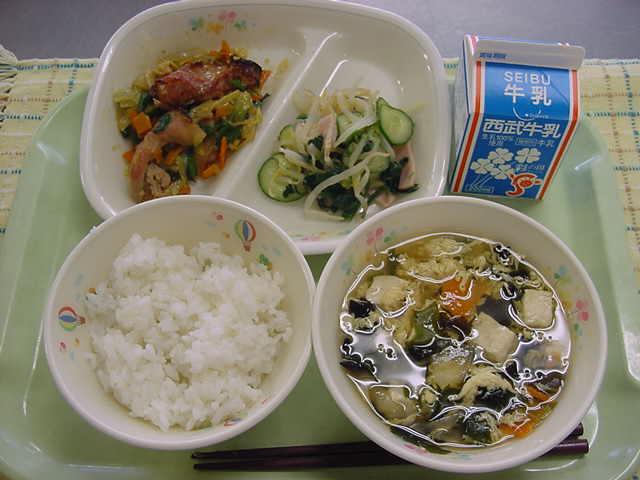 牛乳 ご飯 味噌だれ焼き肉 もやしのナムル 中華スープ