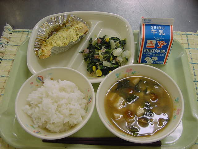 牛乳 ご飯 鮭のマヨネーズ焼き ほうれん草ソテー