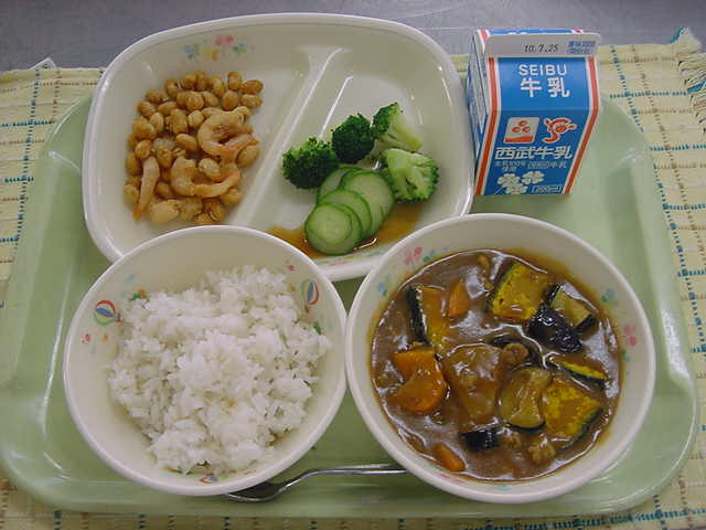 牛乳 夏野菜のカレーライス 大豆のカリカリ揚げ