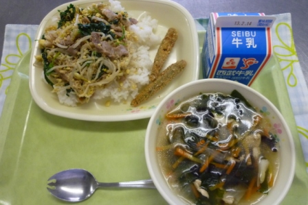牛乳 ビビンバ 小イワシの磯辺フライ 中華スープ