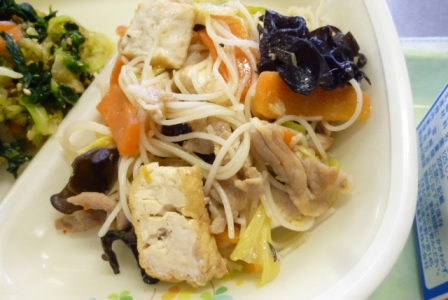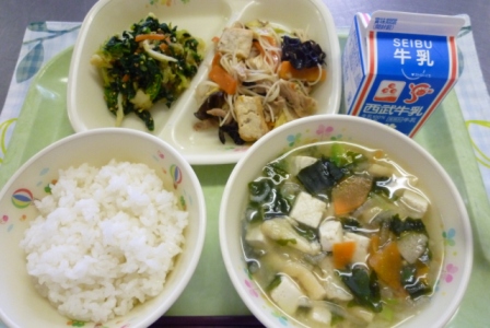 牛乳 ご飯 厚揚げと豚肉の中華炒め ほうれん草のゴマ和え