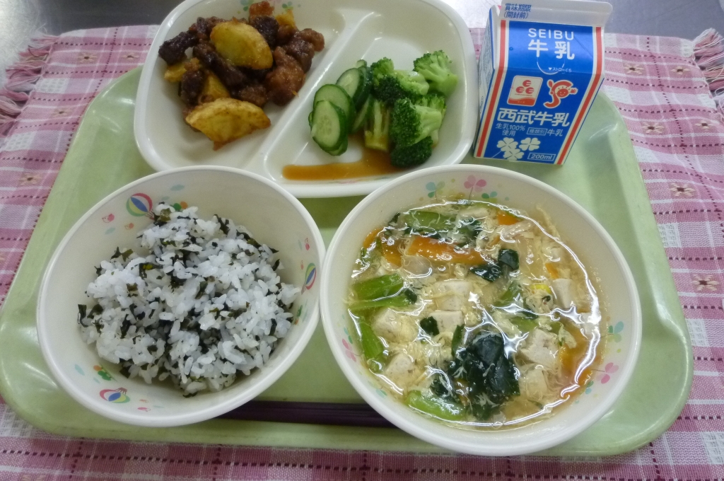 牛乳 わかめご飯 豚肉とレバー&じゃが芋の香味揚げ