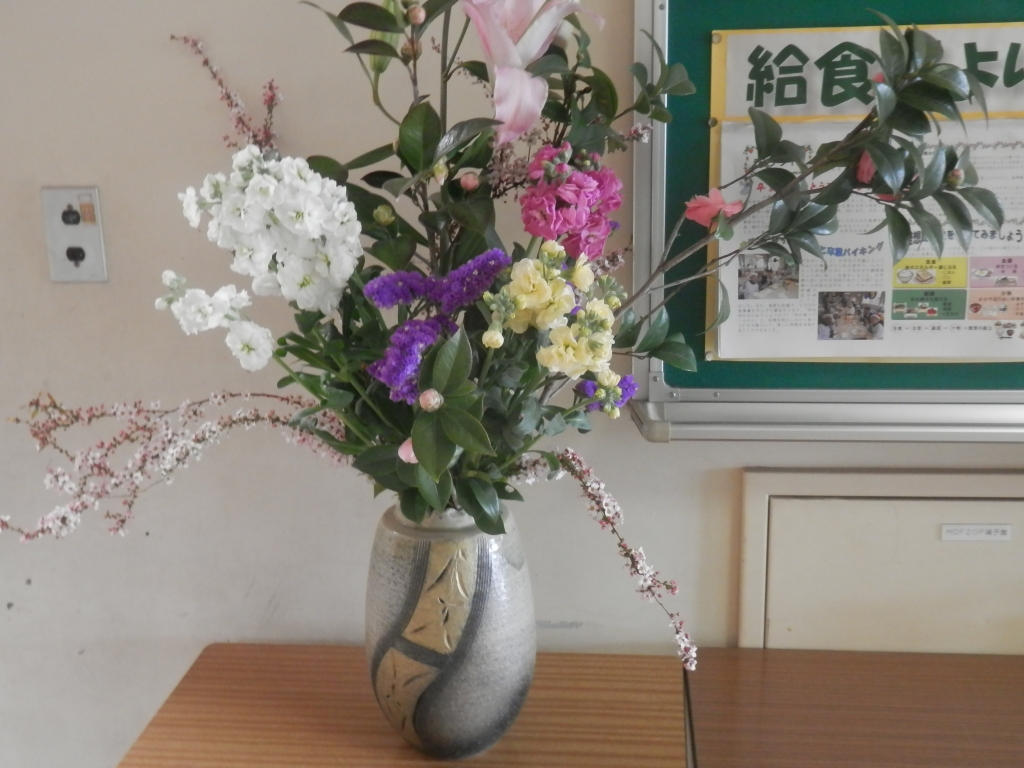 玄関の花を栄養教諭の笠野先生がきれいにしてくれています。今日も美しく生け花が飾られていました。来校者の心をなごませてくれています。いつも「いらっしゃい」と言ってくれているようです。
