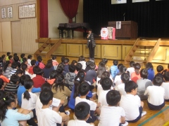 今月の生活目標「本をたくさん読もう」について、図書主任から話しました。今月は「もみじ読書月間」、学年ごとの目標冊数を達成したら、図書室前の掲示にもみじの葉を貼ることにいなっています。