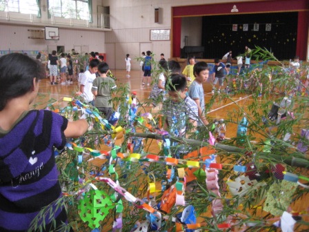 7月7日、午前9時35分~10時20分に七夕集会を体育館で行います。集会を学校公開としますので、お越しください。子ども達の竹飾りや集会の準備もできました。なお、七夕集会には学区の幼稚園児、保育園児を招待しています。