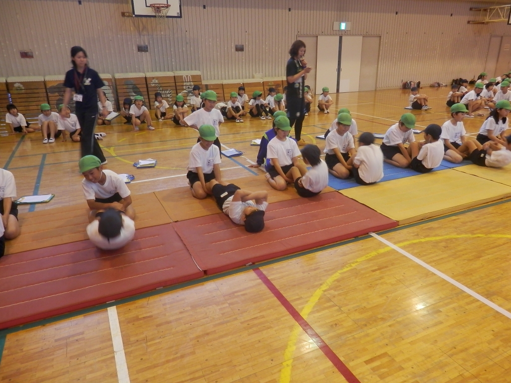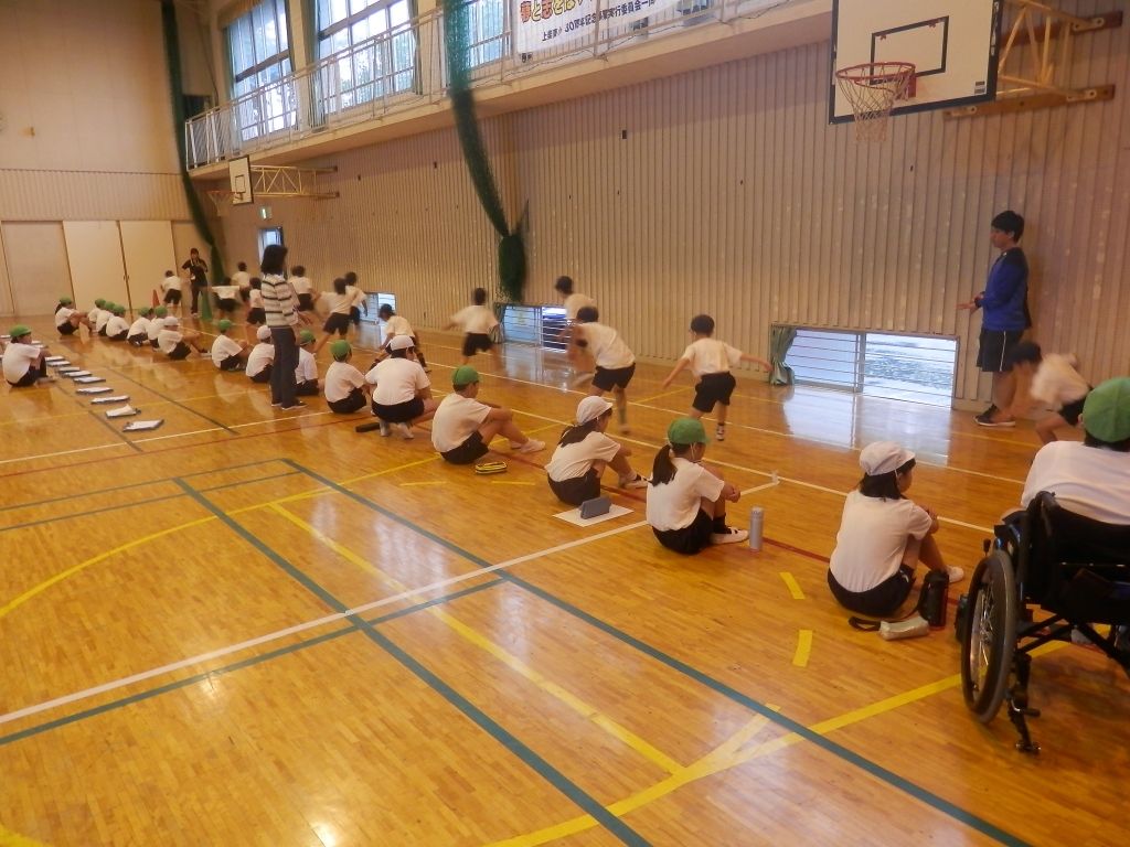 今日は、雨のため新体力テストが体育館での活動となりました。5年生と2年生で行っていました。5年生が2年生の計測と補助をしていました。子供達がんばれ。