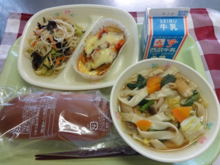 牛乳 黒パン 白身魚のピザ風 焼きビーフン