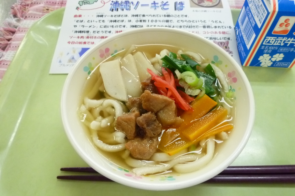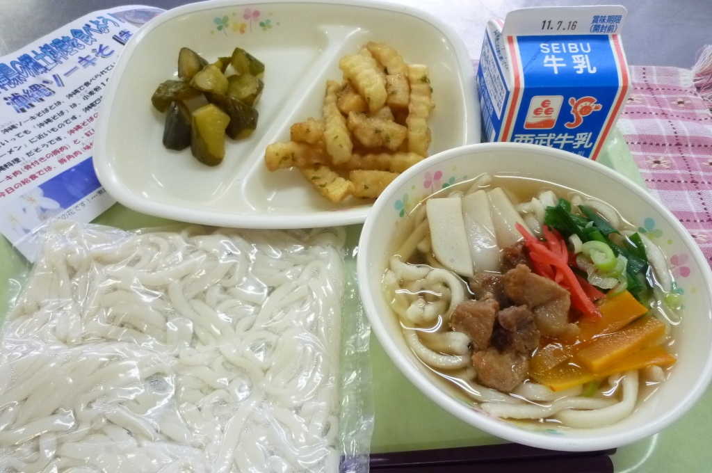 牛乳 沖縄ソーキそば いかとポテトの甘辛煮 きゅうりのピリッと煮