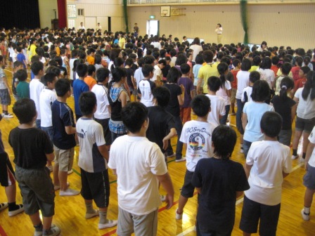 音楽朝会では、「まどをひらいて」を全校で歌いました。体育館の窓も全開にして高音もきれいな声で歌えました。音楽朝会の歌声が「朝の会」の歌になり、歌声が響きます。