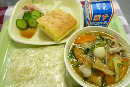 牛乳 しょうゆラーメン チーズパンケーキ ハムと大根のサラダ