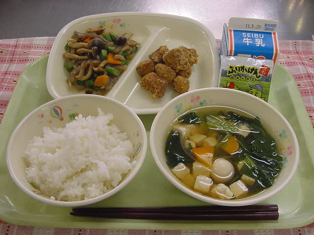 牛乳 ご飯 カツオの香味揚げ 突きコンとしめじのピリ辛炒め