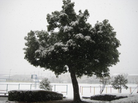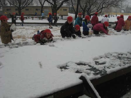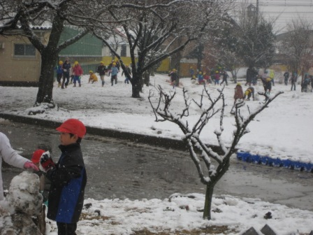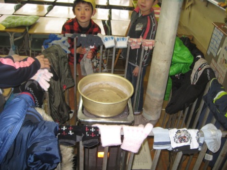 登校時に降っていた雪もやみ、青空が見えています。今年初めての雪に子ども達は大喜びでした。ウッドデッキの周辺やプールの周りの草地で雪遊びを体験していました。一方、教室では、手袋を乾かすのにストーブが活躍です。