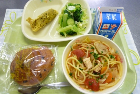 牛乳 チョコチップロール ウィンナーの香味揚げ ブロッコリーサラダ