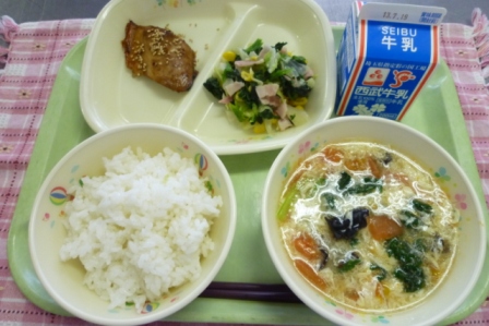 今日の給食・牛乳 ご飯 さばのソース焼き ほうれん草とベーコンのソテー