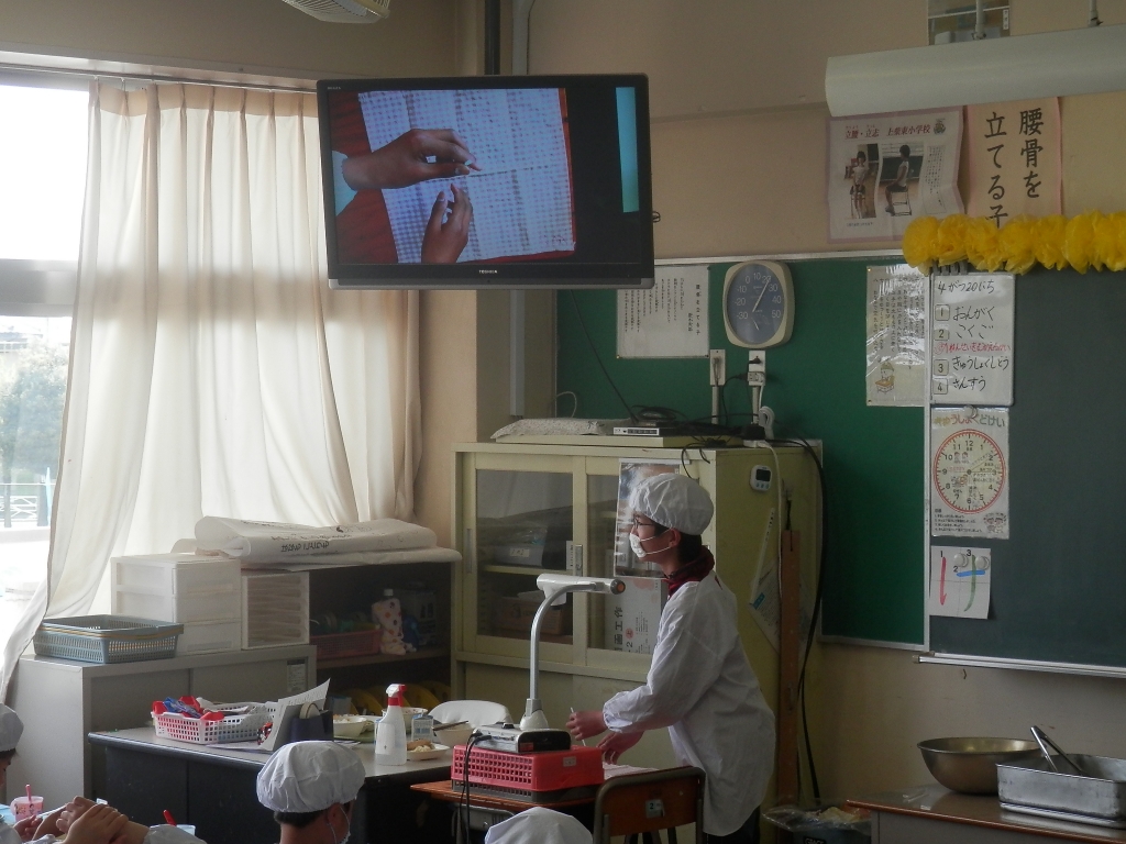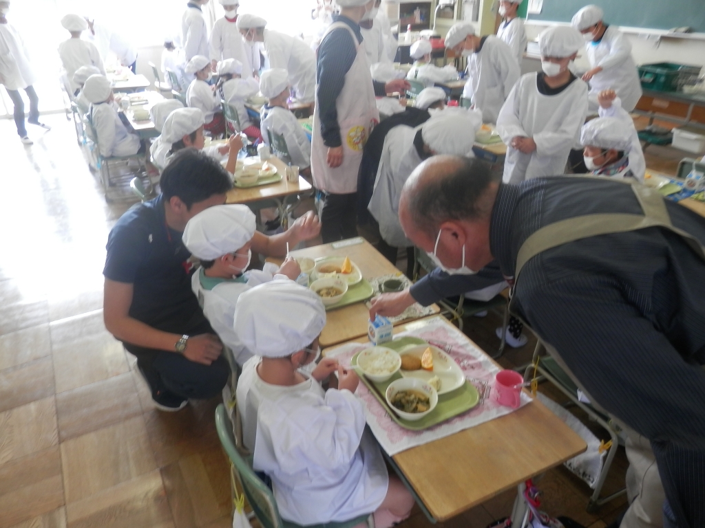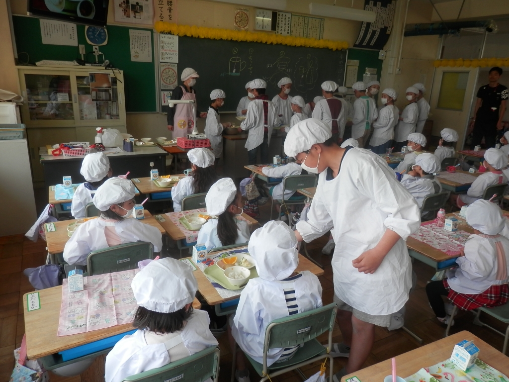 今日から1年生の給食も始まりました。6年生が手際よく配膳をしました。1年生は、身支度をして姿勢よく席についていました。牛乳パックににストローをさすところも6年生が教えていました。これから覚えていきましょう。
