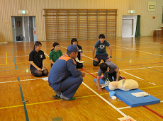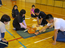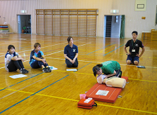プール開きを来週に控え、「もしも」の時のために先生方が救急法の研修をしました。心肺蘇生のための胸骨圧迫と人工呼吸、そして、AEDの使い方を学びました。先生方の顔も真剣そのもの。水の事故が起こらないように、普段から「早寝、早起き、朝ごはん」を心がけて体調管理をお願いします。