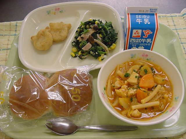 牛乳 ハチミツパン 鶏肉とマカロニのトマト煮