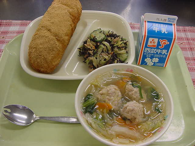 牛乳 きな粉揚げパン ツナとヒジキのスープ