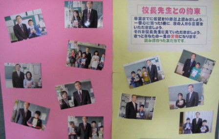 6年生には、5年生のときから約1年間に伝記を10冊読みましょうと呼びかけています。そして読んだ伝記の中から自分の目標とする人を選び、自分の小遣いとお家の人から半分ずつお金を出して伝記を買い、自分とお家の人のメッセージを書くことをお願いしました。現在、たくさんの6年生が自分の伝記を手にしています。なお、伝記には激励の言葉を書かせてもらっています。(記念写真は6年生の廊下に貼りだしています。)