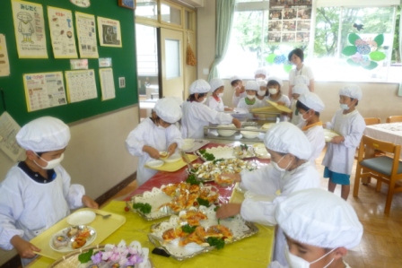 赤・黄・緑の働きとその食品を学習してから、バイキング給食を行います。