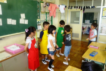 バイキング給食の事前指導では、赤・黄・緑エプロンのポケットの中に、