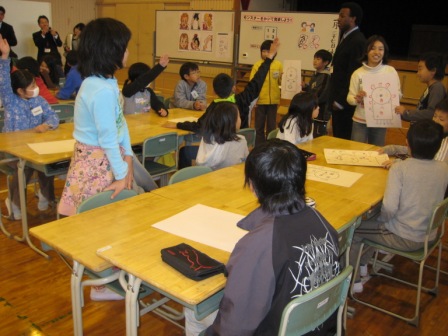 深谷市内の小中学校全体で取り組んでいる「英語教育改善のための調査研究」の一環として、上柴地区3校の教員が集まり、外国語活動の授業公開と研究会を行いました。4年2組の子ども達は担任とALTと一緒に英語を聞き、英語で話していました。外国語の授業では英語によるコミュニケーションの体験をもてるようにしていきます。