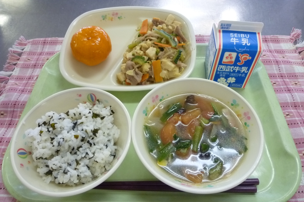 牛乳 わかめご飯 ゴーヤチャンプルー 夏風スープ