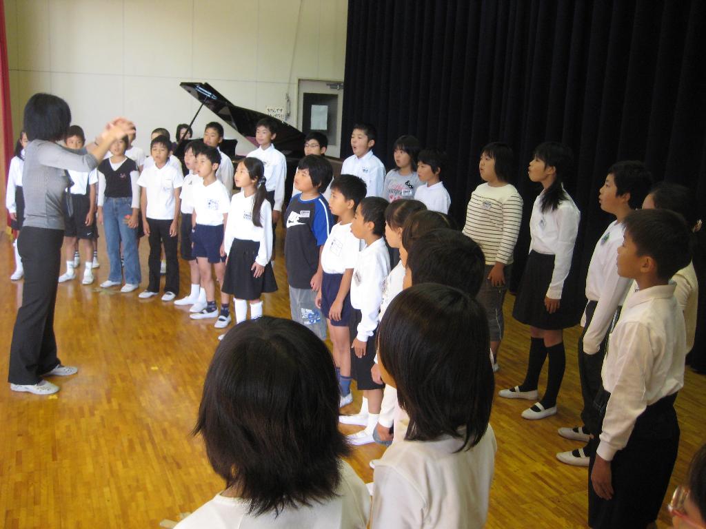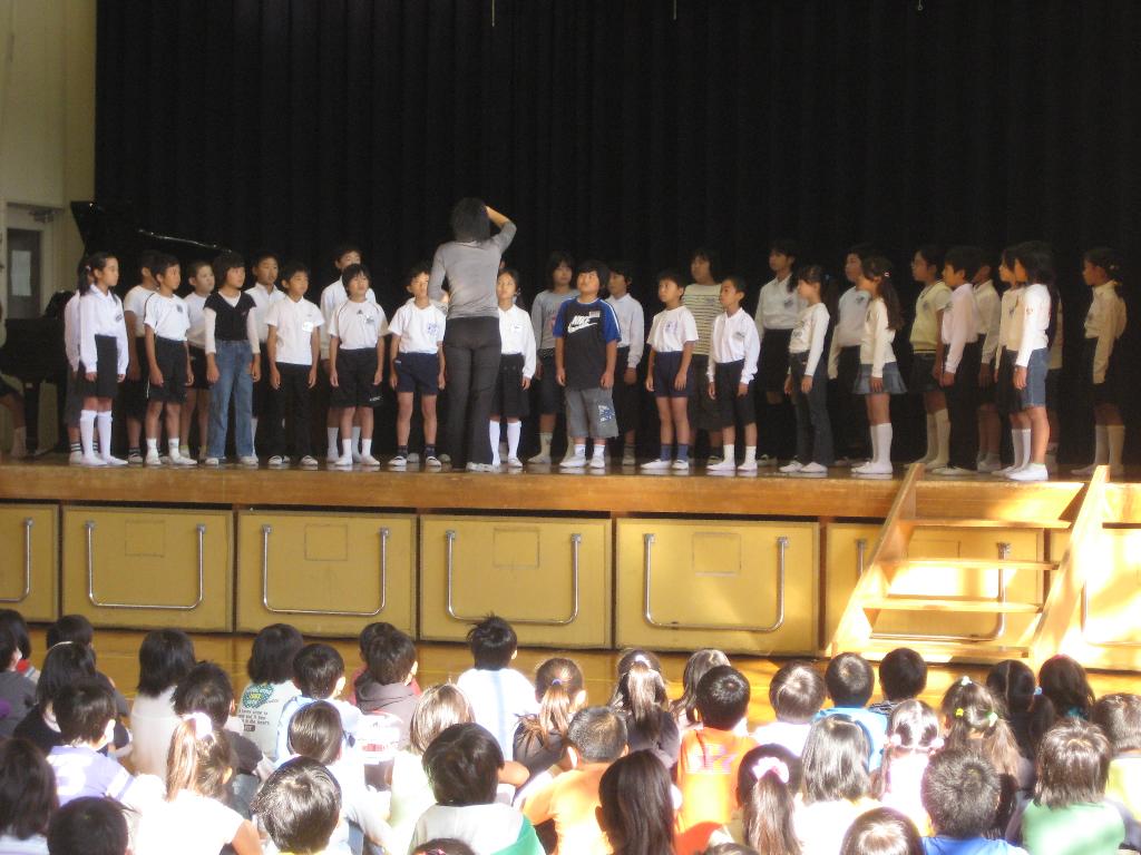 4年3組は10月28日に行われる市内小学校音楽会に出場します。練習を重ねた歌声を音楽朝会で披露しました。「銀曜日のおとぎ話」「天使の羽のマーチ」の2曲を、きれいな声でリズムにのって、クラス全員でハーモニーを醸し出していました。深谷市民文化会館のステージが楽しみです