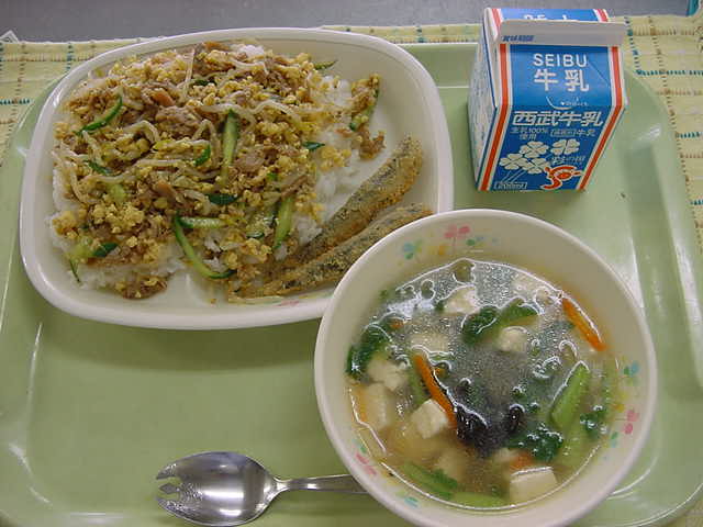 牛乳 ビビンバ 小イワシフライ 中華スープ