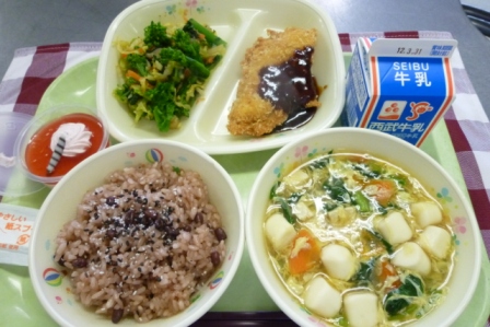 牛乳 お赤飯 菜の花あえ 味噌カツ かきたま汁