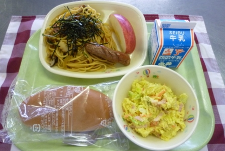 牛乳 黒パン 和風スパゲティ 焼きウィンナー