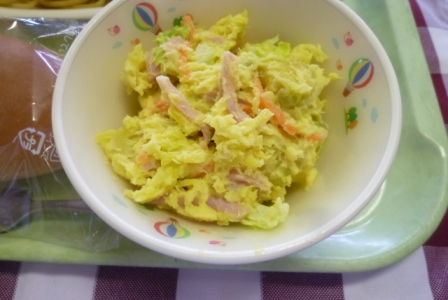 熱いうちにつぶし、春キャベツや人参、ハムを混ぜ