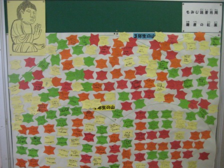 第2図書室廊下に、子ども達の図書紹介があります。紅葉した葉におすすめの本を書き、鎌倉の山が彩られました。この取組は今月の図書だよりでも紹介します。大仏もさまざまなお客さんでほほを染めているようです。