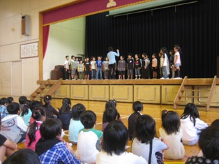 今日の音楽朝会は、10月25日の市内小学校音楽会に出場する4年1組の合唱を全校で聴きました。曲目は「気球に乗ってどこまでも」「大きな古時計」です。練習の成果が美しい歌声とハーモニーに表れていました。本番での活躍を全校児童で応援しています。