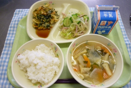 牛乳 ご飯 ほうれん草のかき揚げ・天つゆ たくあんサラダ