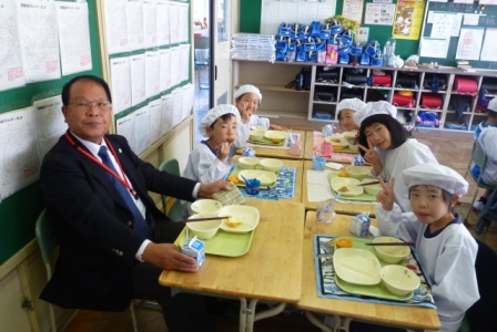 授業を見学した後、子どもたちと一緒に給食を