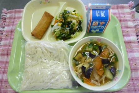 牛乳 田舎うどん 春巻き ワカメサラダ