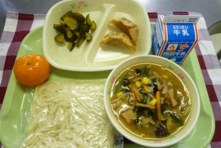 牛乳 ゴマ味噌ラーメン カリカリ餃子 きゅうりのピリッと漬け