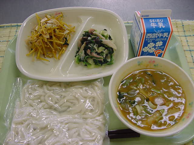 牛乳 カレーうどん 小魚入り松葉芋 青菜ときのこソテー
